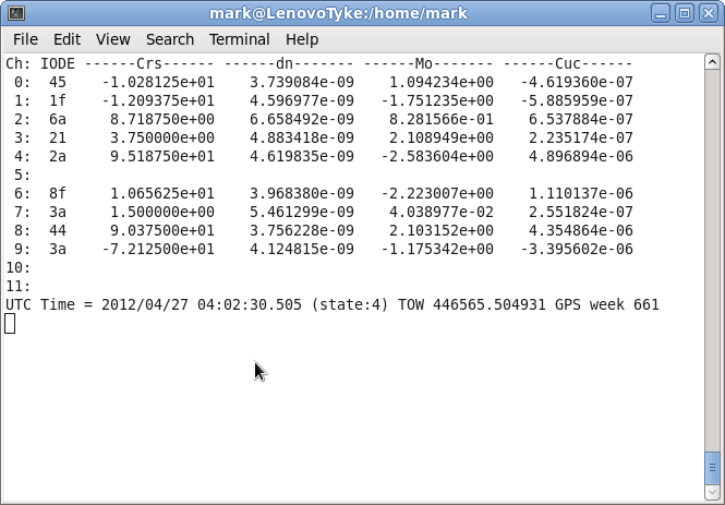The Ephemeris display consists of 6 sub-screens that show the values of all the fields that are transmitted as part of the Ephemeris message. Every time 'e' is entered the next sub-screen is displayed until the last one is reached at which point it starts from the beginnning.
