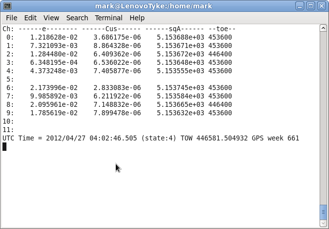 The Ephemeris display consists of 6 sub-screens that show the values of all the fields that are transmitted as part of the Ephemeris message. Every time 'e' is entered the next sub-screen is displayed until the last one is reached at which point it starts from the beginnning.
