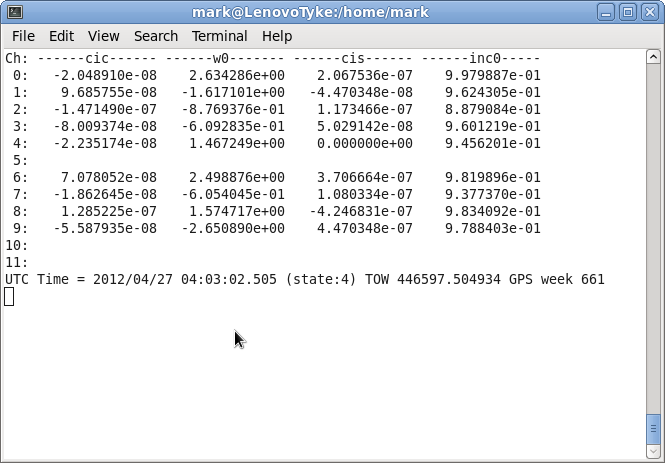The Ephemeris display consists of 6 sub-screens that show the values of all the fields that are transmitted as part of the Ephemeris message. Every time 'e' is entered the next sub-screen is displayed until the last one is reached at which point it starts from the beginnning.